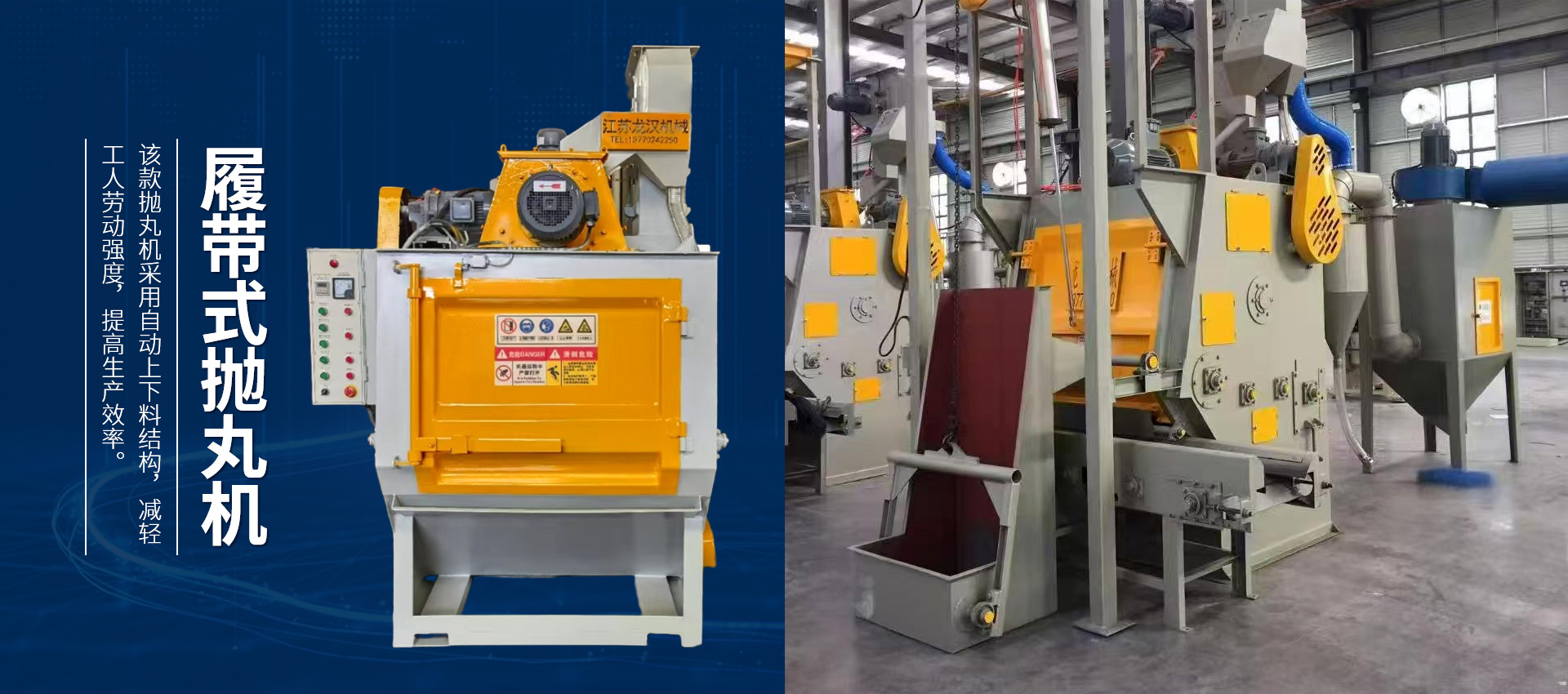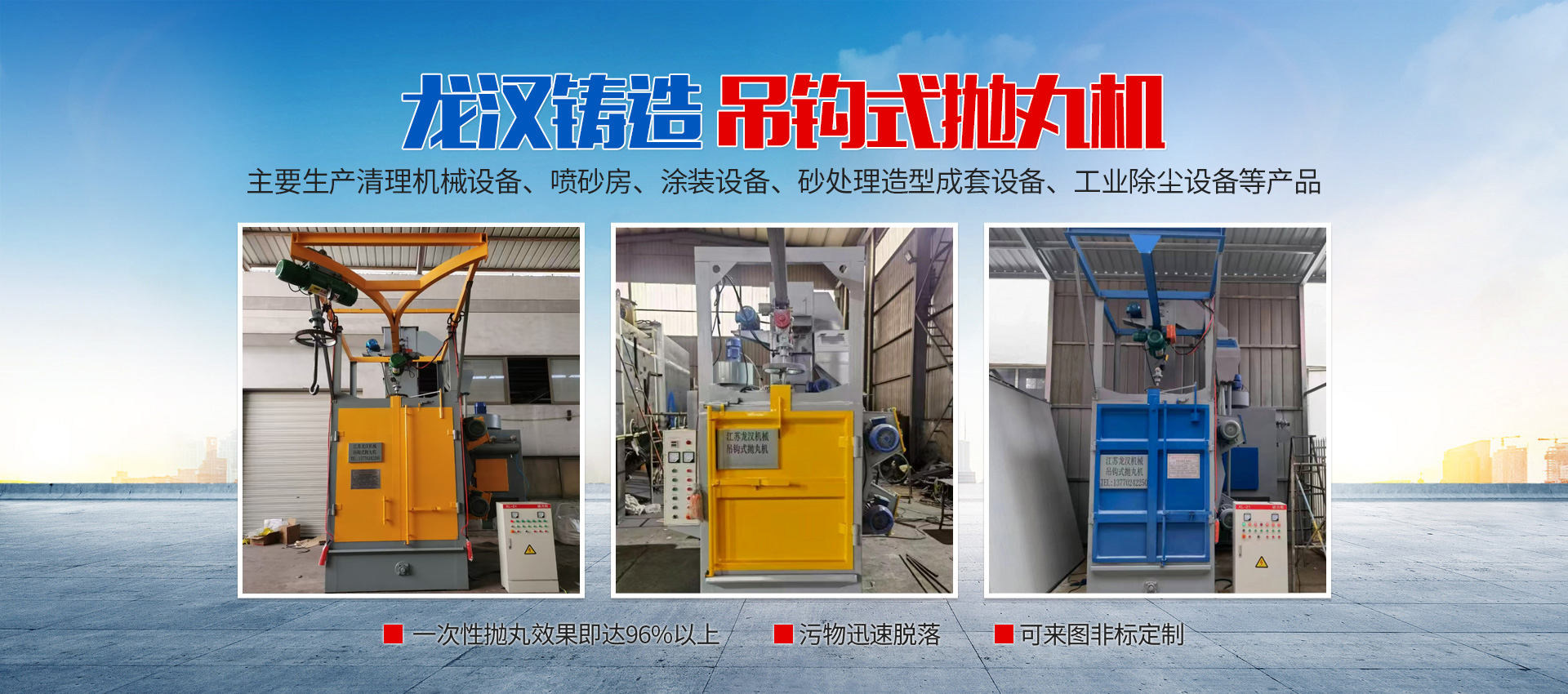 【現(xiàn)場安裝圖集】:簡介:吊鉤式拋丸機分為單吊鉤和雙吊鉤,拋丸機由吊鉤裝載工件交替進入拋丸清理室內(nèi)。利用拋...